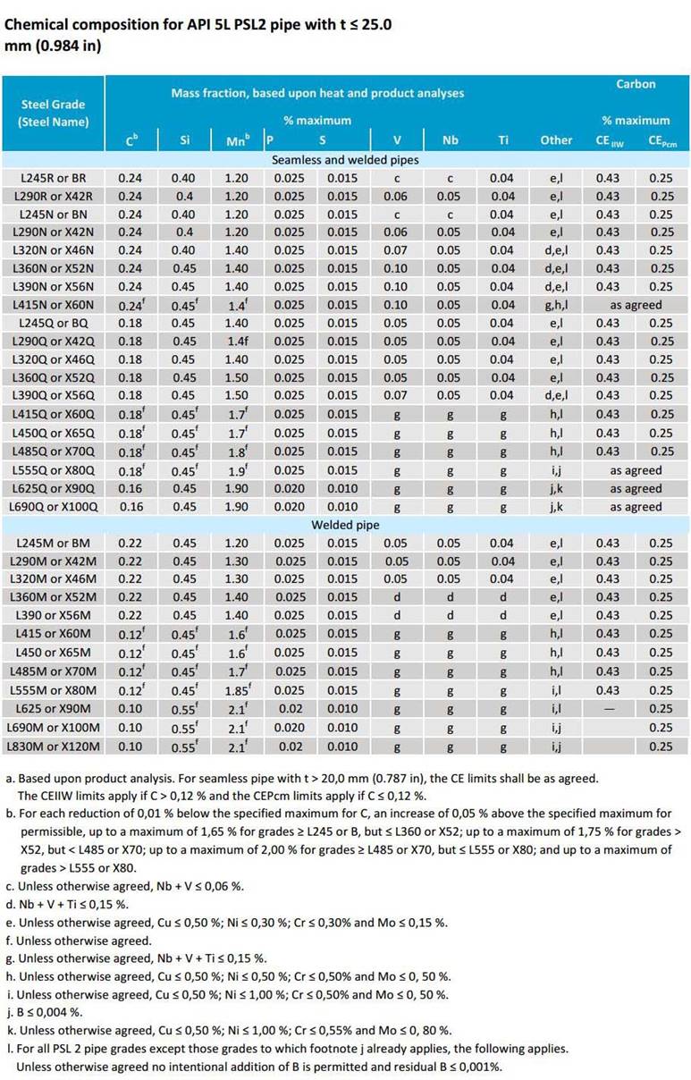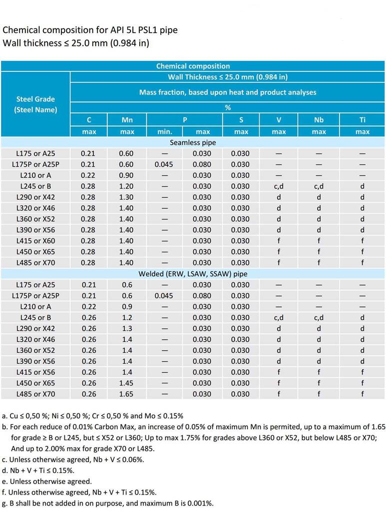 Chemical composition for PSL1 line pipe with wall thickness ≤ 25.0 mm (0.984 inch)